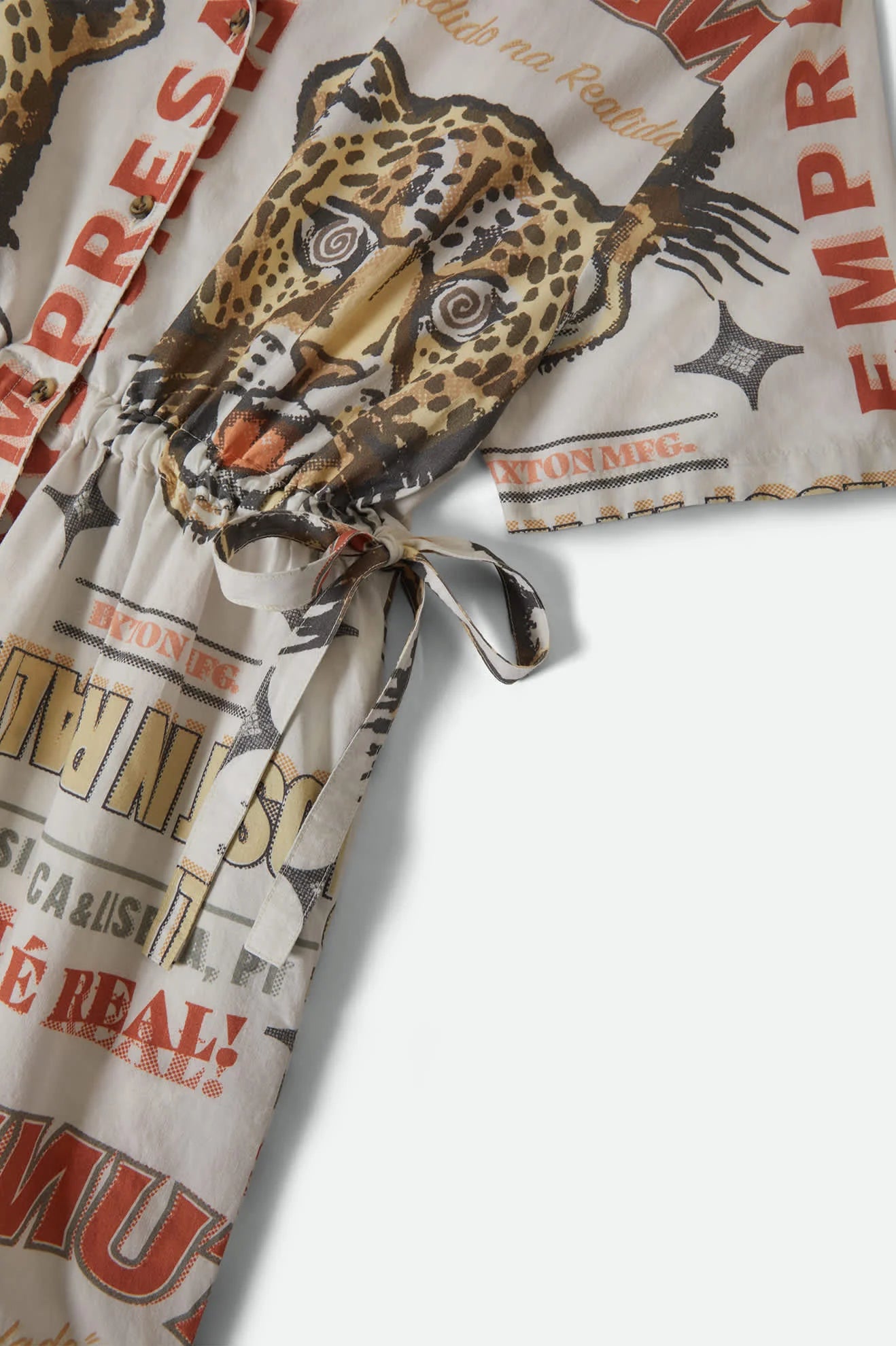 Wild prints meet relaxed comfort in this statement dress. The Cinch Dress is made from 55% cotton and 45% rayon with a vintage-styled jaguar print that brings fierce energy to your wardrobe. Camp collar and center front button closure keep the silhouette classic, while the cinched waist creates a flattering shape. The relaxed fit moves with you from beach walks to dinner dates, making it your go-to for anytime you want to make an impression.